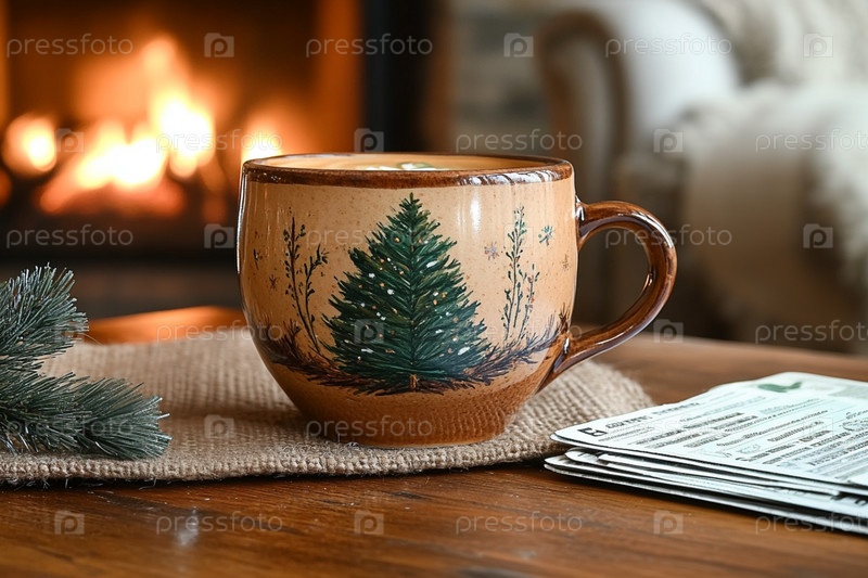 Коричневая чашка для капучино с нарисованной на ней зеленой елью стоит на столе в гостиной, рядом с квитанциями, на заднем плане — камин
