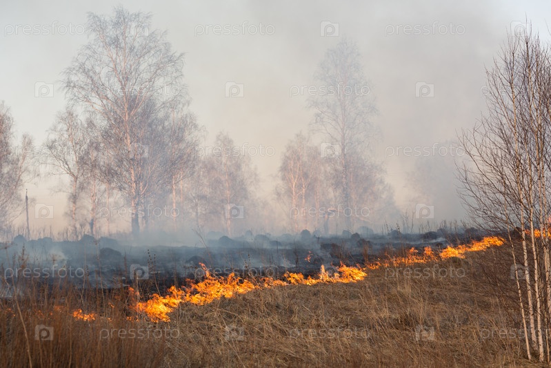 Лесной пожар горит, лесной пожар крупным планом в дневное время