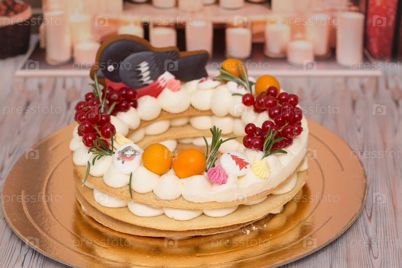 Красивый праздничный торт, украшенный декором и свежими ягодами
