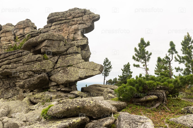 Большие камни курума лежат в лесу в горах, камни покрытые мхом, на фоне леса, горный пейзаж, высоко в горах