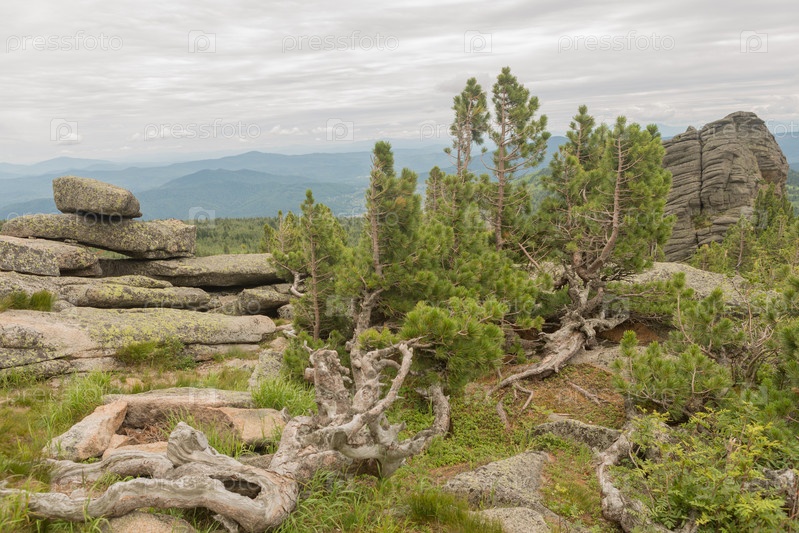Большие камни курума лежат в лесу в горах, камни покрытые мхом, на фоне леса, горный пейзаж, высоко в горах