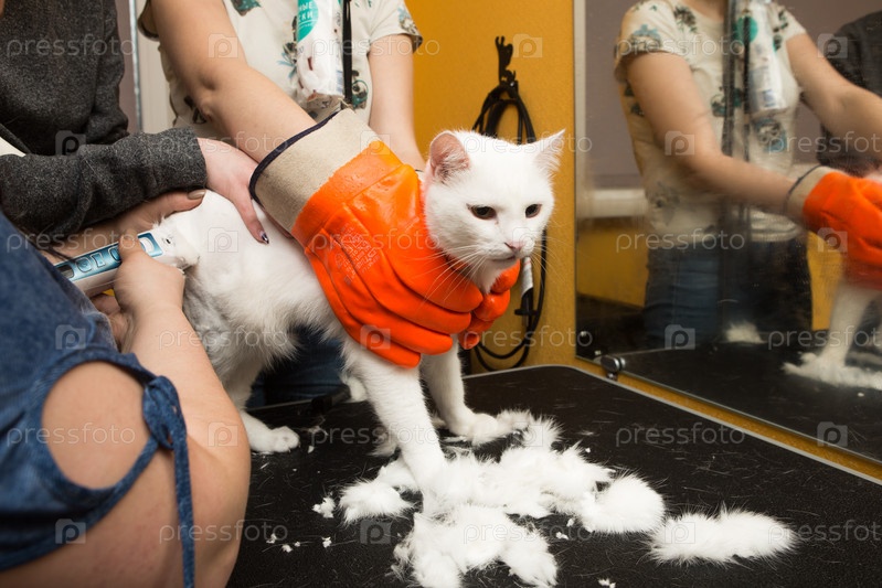 Стрижка кошек в салоне для животных. Женщина использует триммер для стрижки шерсти