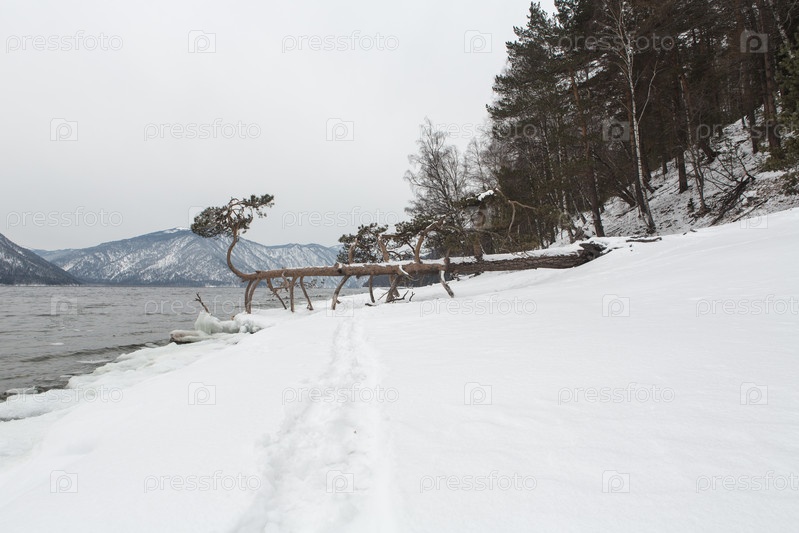 Незамерзающее Телецкое озеро зимой. Россия Алтайский край