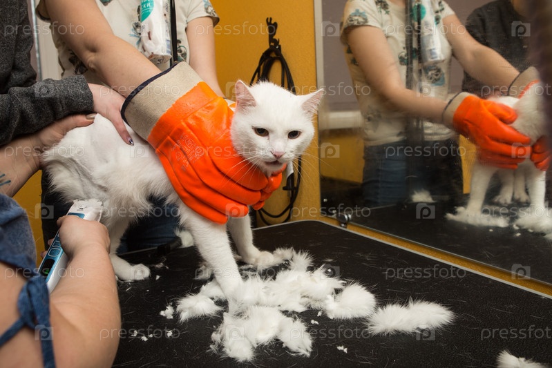 Стрижка кошек в салоне для животных. Женщина использует триммер для стрижки шерсти