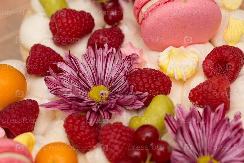 Красивый праздничный торт, украшенный декором и свежими ягодами