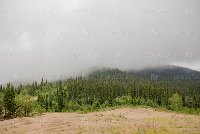 Лесная тропа туманным весенним утром после ночного дождя