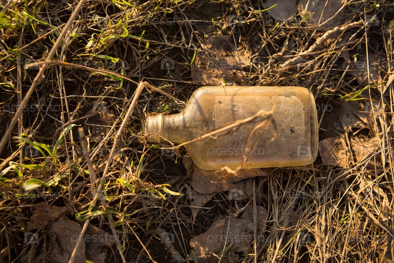 Мусор в лесу. Стеклянная бутылка, выброшенная в лесу. Проблема экологии и загрязнения природы
