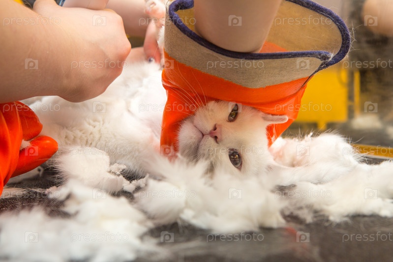 Стрижка кошек в салоне для животных. Женщина использует триммер для стрижки шерсти