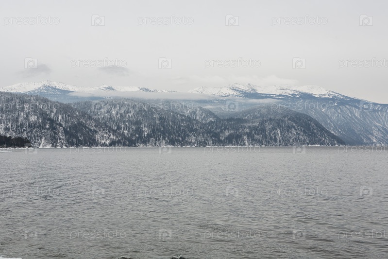 Незамерзающее Телецкое озеро зимой. Россия Алтайский край