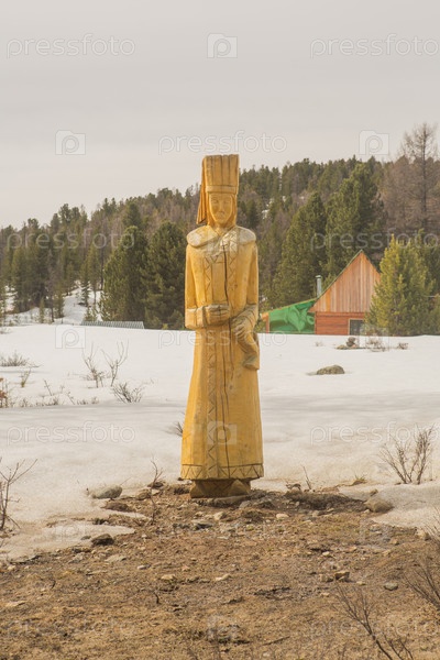 Старые деревянные скульптуры в лесу. Горный Алтай, Россия