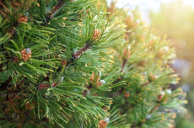 Густые пушистые ветки с сосновыми иголками в лучах утреннего солнца
