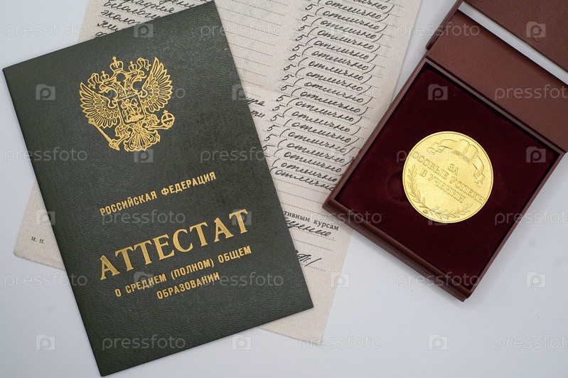 Аттестат с отличием, приложение к аттестату и золотая медаль за особые успехи в учении на белом фоне
