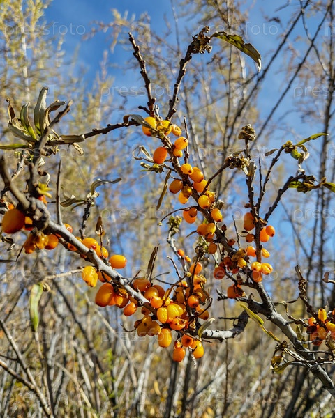 Ягоды облепихи в осенний день. Ветки, усыпанные спелыми оранжевыми ягодами облепихи, на кусте осенью