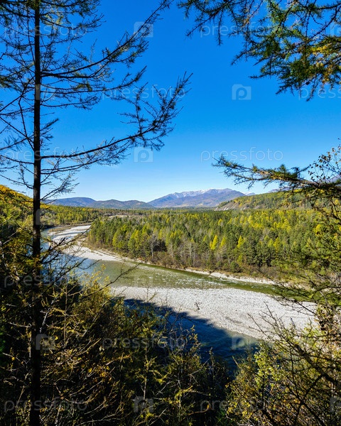Горная река осенним днем. По лесу течет ручей. Осенняя река. Узкая, бурная горная река в хвойном лесу. Большой камень в красивом ручье. Горная река