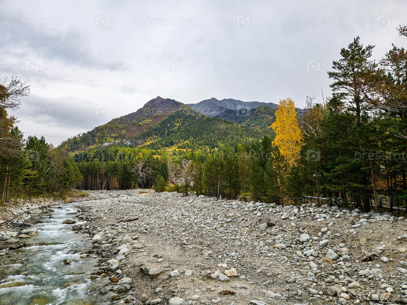 Горная река осенним днем. По лесу течет ручей. Осенняя река. Узкая, бурная горная река в хвойном лесу. Большой камень в красивом ручье. Горная река