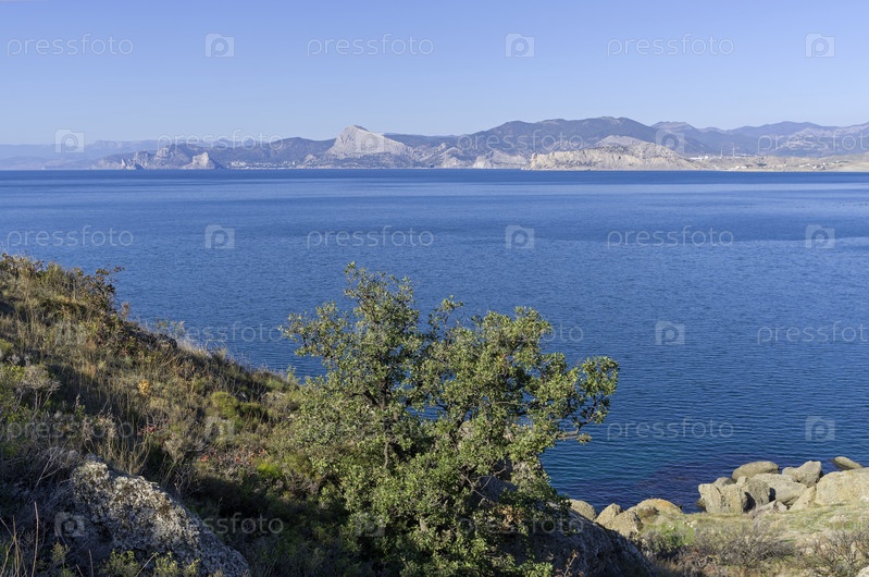 Вид со склона мыса Меганом в сторону Судака и Нового Света. Крым. Середина октября, солнечно