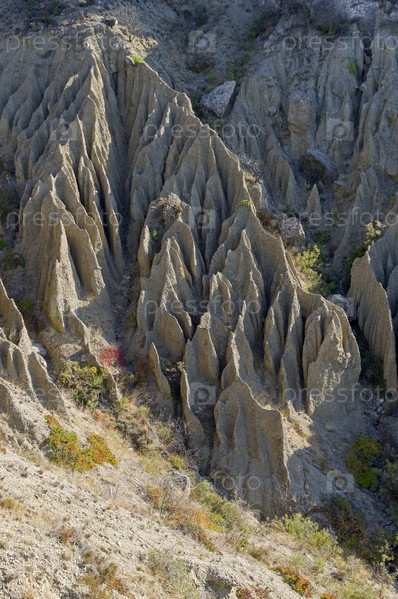 Причудливый рельеф, возникший на глиняном склоне у подножья мыса Меганом в результате эрозии и выветривания. Крым. Середина октября, солнечно
