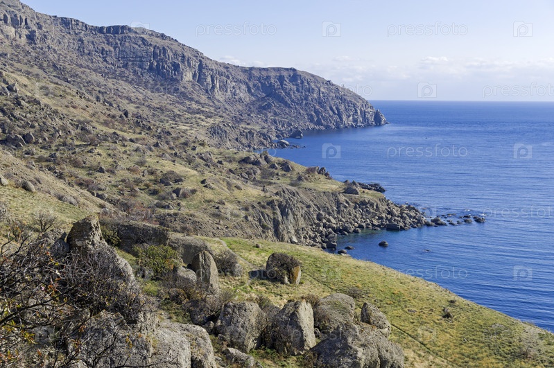 Маленькие бухты на обращенной к морю стороне мыса Меганом. Крым. Середина октября, солнечно