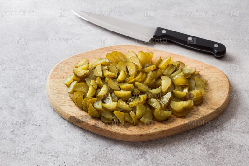 Ломтики маринованного огурца на деревянной доске на сером текстурированном фоне, вид сверху