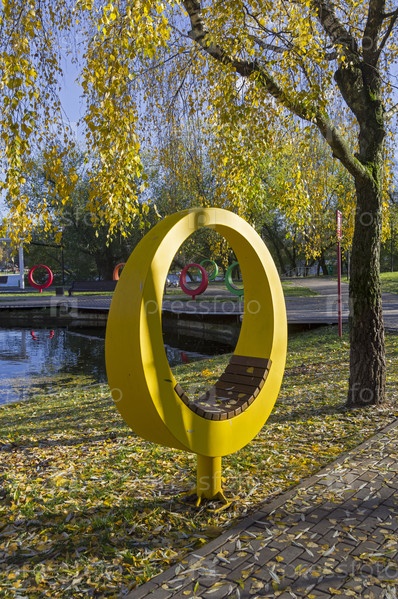 Лавочка оригинальной круглой формы на берегу Малого Коньковского пруда. Улица Введенского, Москва. Солнечный день в начале ноября