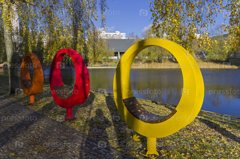 Лавочки оригинальной круглой формы на берегу Малого Коньковского пруда. Улица Введенского, Москва. Солнечный день в начале ноября