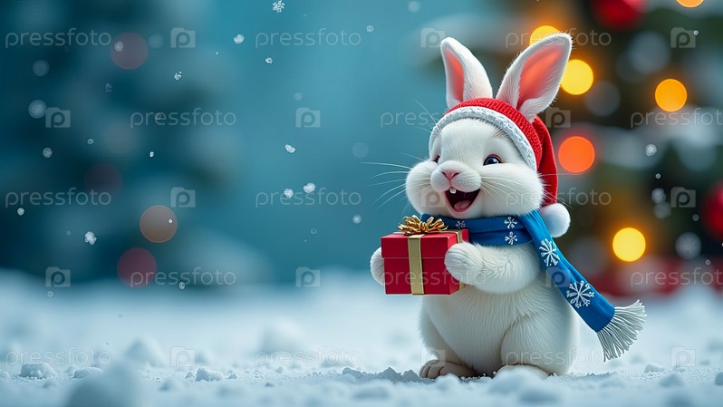Белый кролик в шапке и шарфе Санта-Клауса стоит рядом с рождественской елкой