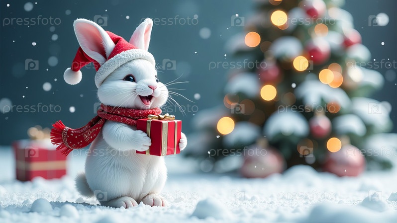 Белый кролик в шапке и шарфе Санта-Клауса стоит рядом с рождественской елкой