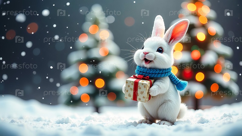 Белый кролик в шапке и шарфе Санта-Клауса стоит рядом с рождественской елкой