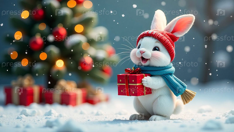 Белый кролик в шапке и шарфе Санта-Клауса стоит рядом с рождественской елкой
