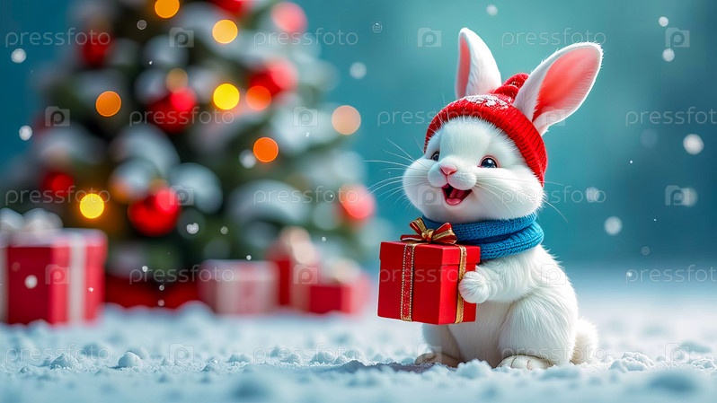 Белый кролик в шапке и шарфе Санта-Клауса стоит рядом с рождественской елкой