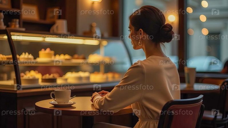 Женщина сидит в кафе с чашкой кофе на фоне витрины с десертами