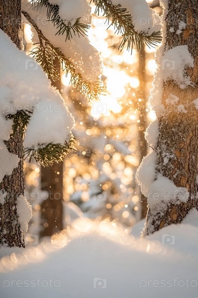 Зимний лесной пейзаж с покрытыми снегом деревьями и солнечными лучами, пробивающимися сквозь ветви
