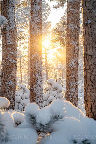 Зимний лесной пейзаж с покрытыми снегом деревьями и солнечными лучами, пробивающимися сквозь ветви