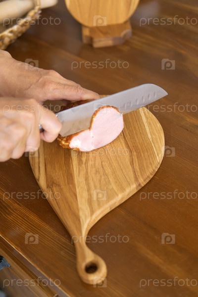 Человек режет ветчину на разделочной доске