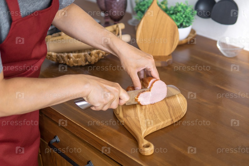 Человек режет ветчину на разделочной доске