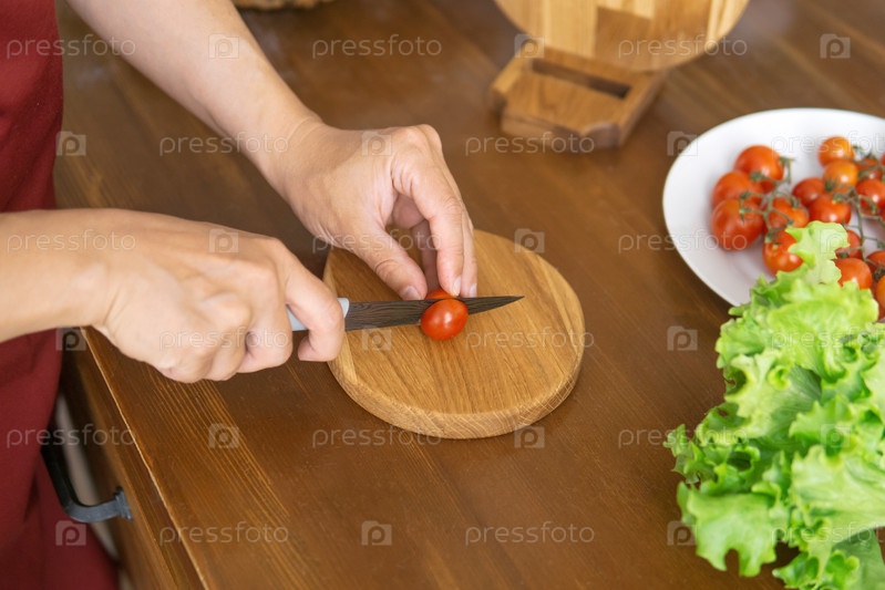 Человек режет помидоры черри на разделочной доске