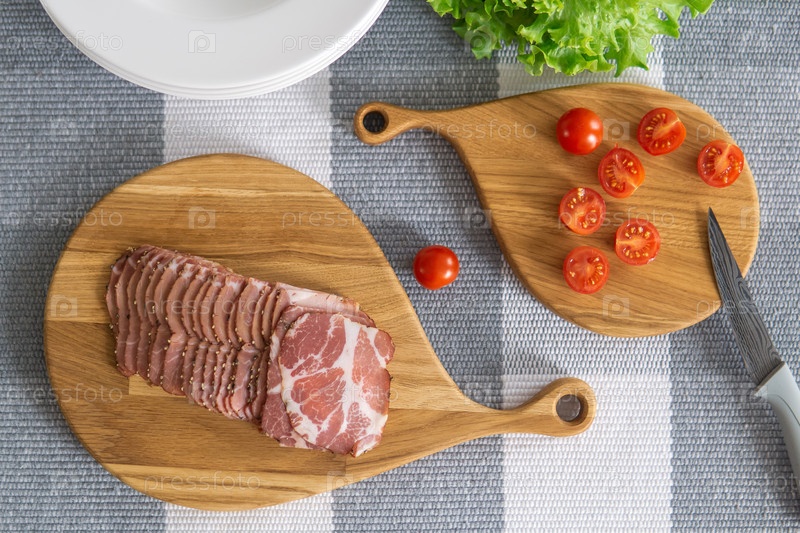 Помидоры черри и нарезанная ветчина на разделочных досках на столе