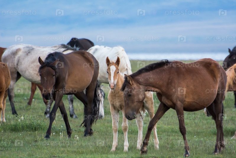 Лошиди и жеребенок бродят по горным пастбищам