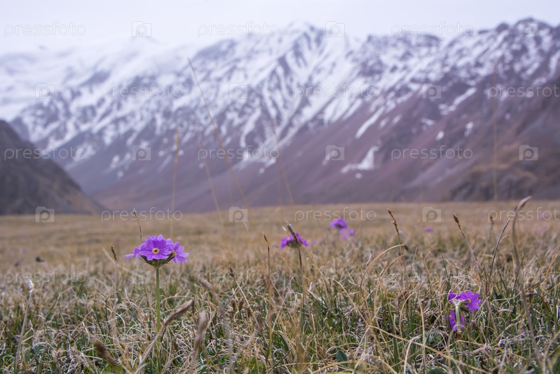 Горные цветы на зеленом поле Кыргызстана