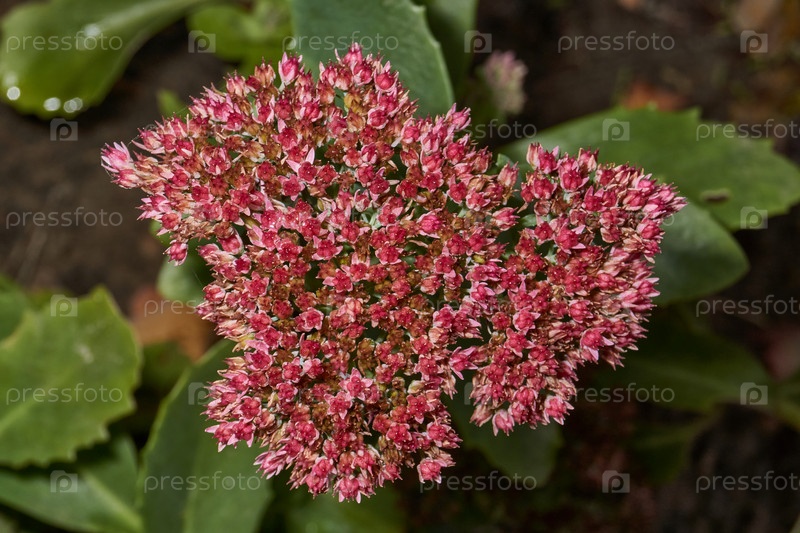 Очиток выдающийся, крупный план цветущего соцветия утром после первых заморозков в саду. Очиток выдающийся — многолетнее травянистое растение, суккулент