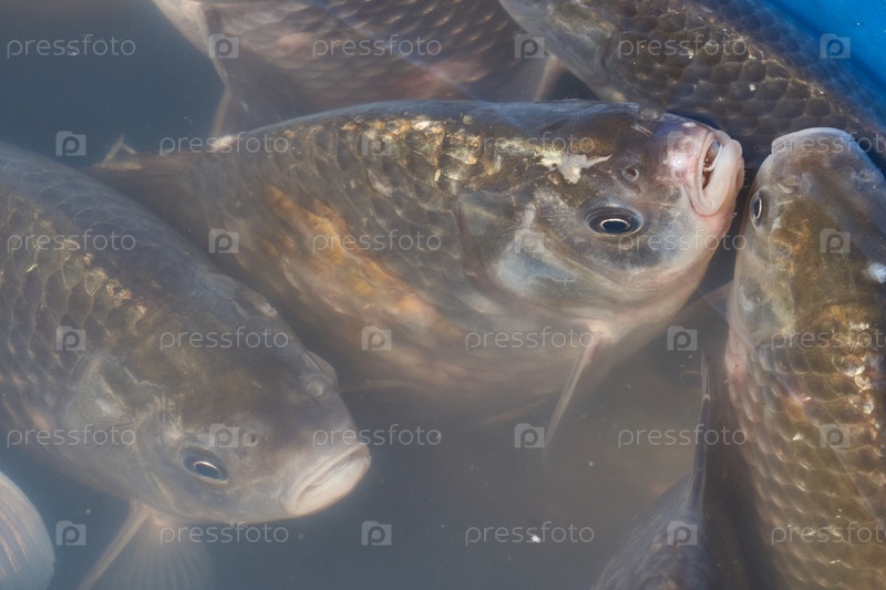 Караси плавают в искусственном пруду. Крупный план рыбы у поверхности воды - спокойное плавание под прозрачной гладью пруда