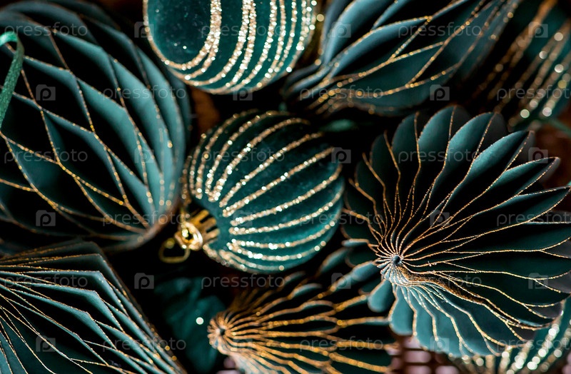 Баннер или красивый фон. Стильные бумажные и бархатные елочные игрушки в скандинавском стиле. Зеленые тона. Концепция стильного нового года и Рождества 2025