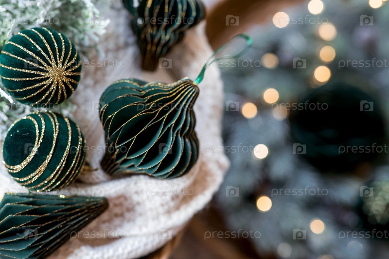 Баннер или красивый фон. Стильные бумажные и бархатные елочные игрушки в скандинавском стиле. Зеленые тона. Концепция стильного нового года и Рождества 2025