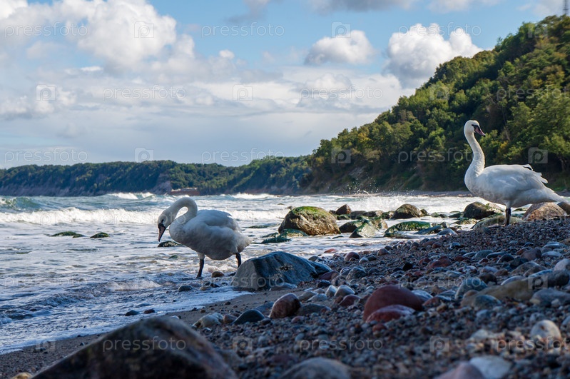 Лебеди в море. Белые птицы в дикой природе. Лебедь на берегу моря