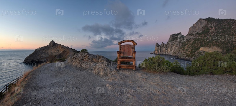 Россия, Новый Свет. Восхитительный рассветный вид на с мыса Капчик на окружающую бухту Крымского полуострова