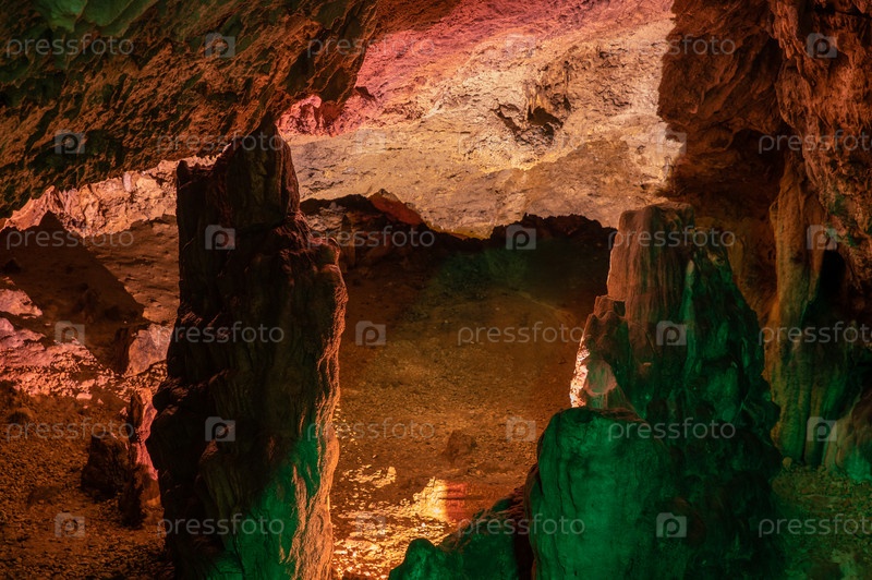 Сталактиты и сталагмиты в пещере, подсвеченные разным цветом