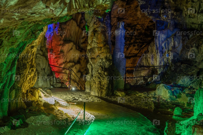 Сталактиты и сталагмиты в пещере, подсвеченные разным цветом