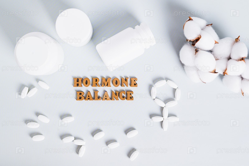 Концепция гормонального баланса, таблетки, бутылки и текст на синем фоне вид сверху