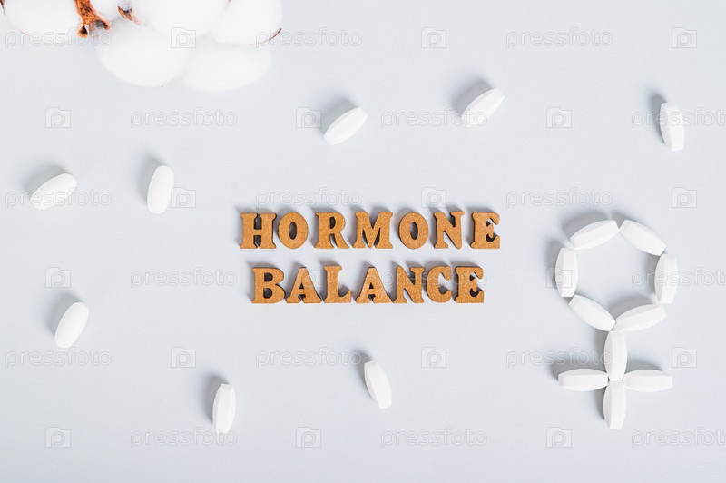Концепция гормонального баланса, таблетки вокруг текста на синем фоне, вид сверху