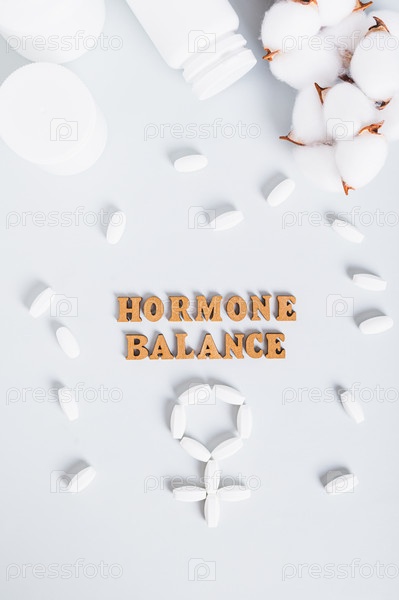 Пищевые добавки для восстановления гормонального баланса на синем фоне сверху и вертикально